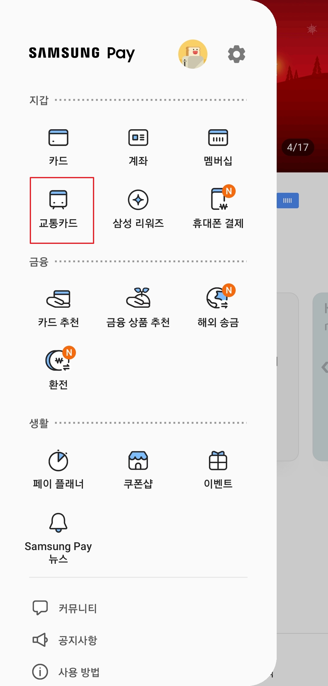 삼성페이 앱을 실행하신 뒤 좌측 상단에 있는 줄 세 개 아이콘(메뉴)을 눌러보시면 다양한 기능들이 보이실 텐데요. 여기서 '교통카드' 메뉴를 찾아 들어가 주시면 됩니다. 처음 설정하시는 분들은 메뉴 위치를 은근히 헷갈려 하시더라고요.