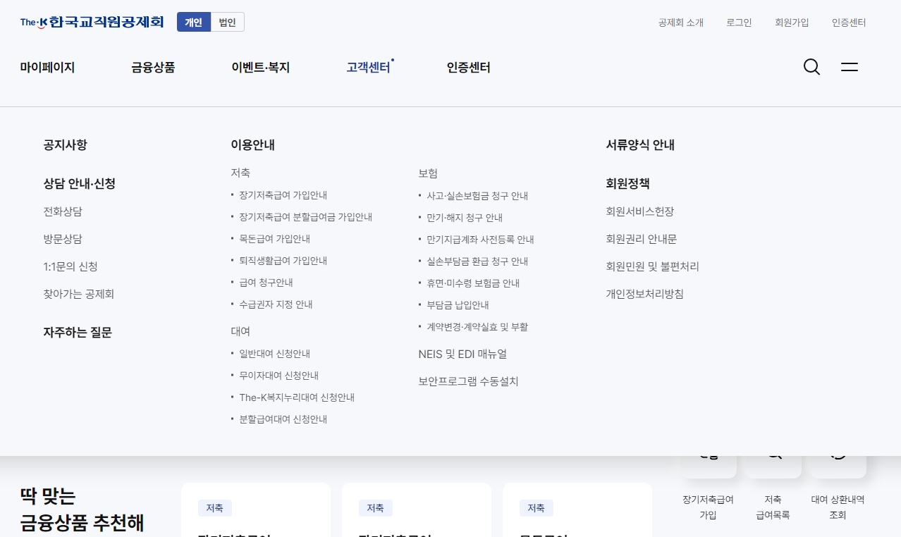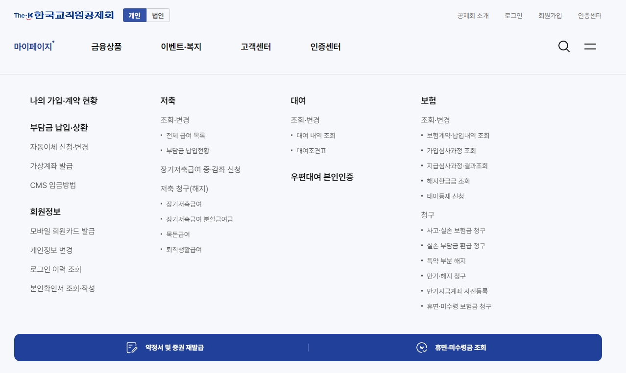 저도 예전에 급하게 목돈이 필요했을 때, 여기서 바로 한도를 조회해보고 큰 도움을 받았던 기억이 나네요. 복잡하게 생각하실 것 없이 상단의 주요 메뉴바를 통해 원하는 서비스로 이동하는 흐름만 익혀두시면, 앞으로 교직 생활하시면서 든든한 금융 파트너로 활용하실 수 있을 거예요.