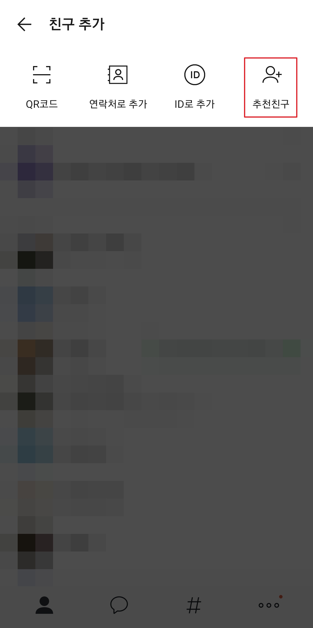 목록을 쭉 내리다 보면 낯익은 이름이나 프로필 사진을 발견하실 수 있을 거예요. 하지만 만약 상대방이 친구 추천 허용 설정을 꺼두었다면 이 목록에도 나타나지 않습니다. 여기에도 없다면 좀 더 적극적인 방법인 ID나 연락처 검색을 시도해보셔야 합니다.