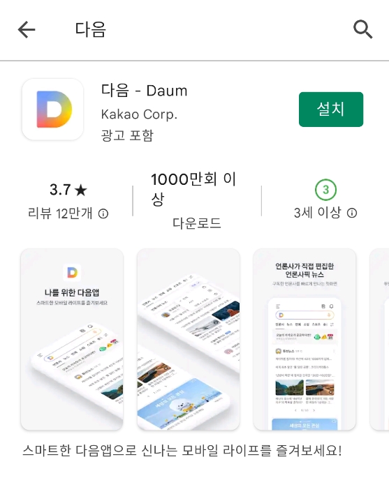 2. 검색 결과에서 가장 위에 표시된 다음 - Daum 앱 옆의 설치 버튼을 누릅니다. 대기 중부터 설치 중 단계가 자동으로 진행되며, 완료되면 열기 버튼으로 바뀝니다.
