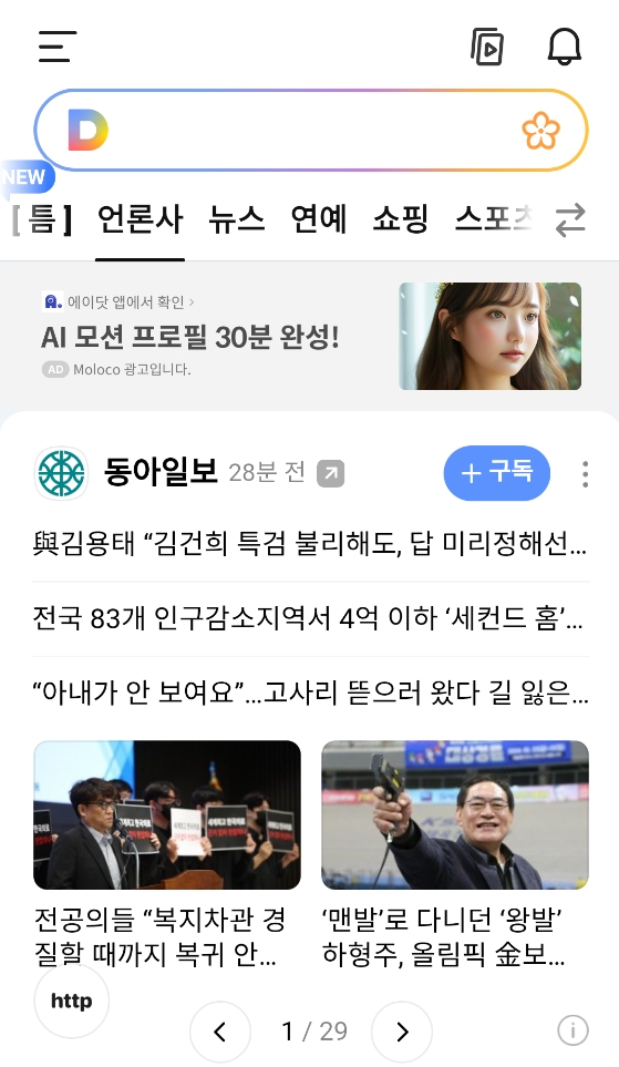 7. 권한 설정 후 완료 버튼을 누르면 메인 화면으로 이동합니다. 홈 화면에서 다음 앱의 주요 메뉴를 통해 뉴스, 검색, 맞춤형 콘텐츠 등을 확인할 수 있습니다.