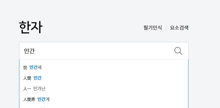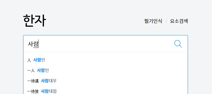 검색창에 '사람'이라고 입력했을 때의 화면을 보면, 단순히 글자 하나만 띡 하고 나오는 게 아니라 연관된 정보들이 줄줄이 사탕처럼 엮여 나오는 걸 볼 수 있어요. '사람 인'부터 시작해서 이름에 쓰이는 한자, 혹은 '사람'이라는 뜻을 가진 다른 글자들까지 관련 어휘가 폭넓게 제시되더라고요.