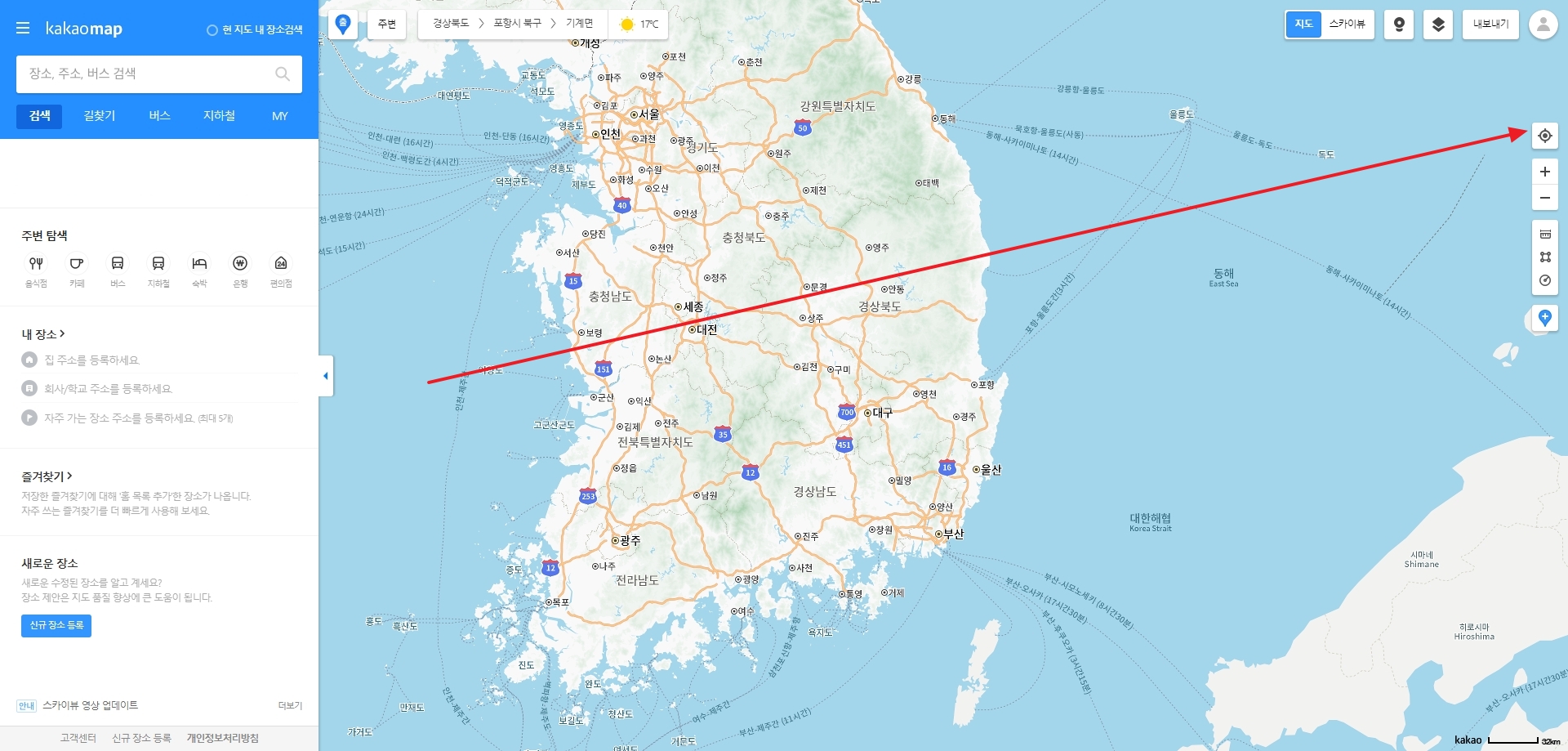 이게 넓은 지역을 보면서 전체적인 위치를 파악할 때는 장점이지만, 당장 내 앞의 골목길을 찾아야 할 때는 조금 불편할 수도 있습니다. 화면이 너무 넓게 잡혀 있으면 내가 점 하나로만 보일 수 있거든요. 그래서 카카오맵을 쓰실 때는 상황에 맞춰 미리 지도를 확대해 둔 상태에서 현위치 버튼을 누르는 요령이 필요합니다.