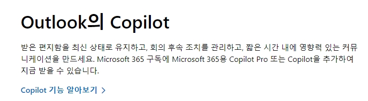 2. 세 번째 사진은 Copilot 기능 소개 화면으로, 받은 편지함 정리와 회의 후속 조치 관리를 돕습니다.