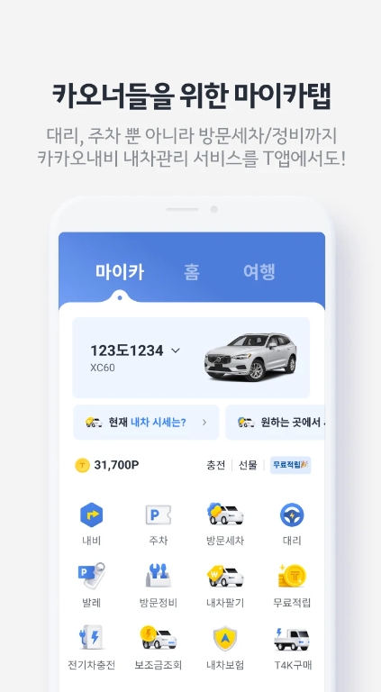 앱 상단을 보시면 메뉴가 여러 가지 탭으로 깔끔하게 나누어져 있는 걸 보실 수 있어요. 최근에 업데이트되면서 마이카(My Car) 탭이 생겼는데, 자차 소유하신 분들은 내 차 정보를 등록해두면 주차장 찾기나 방문 세차 같은 관리도 편하게 할 수 있답니다.