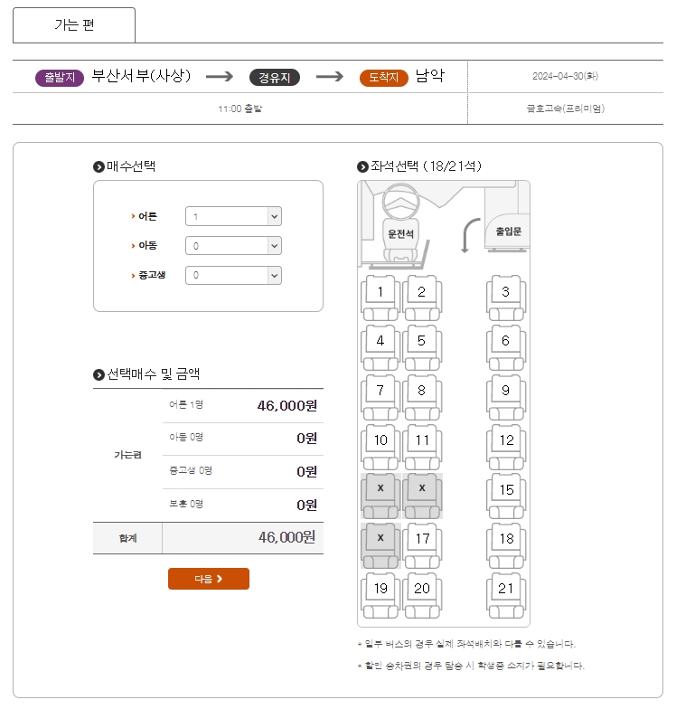 마지막으로 인원수를 체크하고 원하는 자리를 콕 집어서 선택하면 끝입니다. 창가 자리나 앞자리를 선호하신다면 미리 예매하는 게 필수예요. 주말이나 명절에는 좋은 자리가 금방 빠지더라고요.