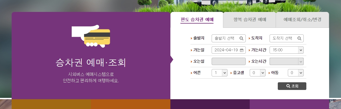시외버스 통합예매시스템 홈페이지 메인 화면에서 승차권 예매 버튼을 찾는 모습