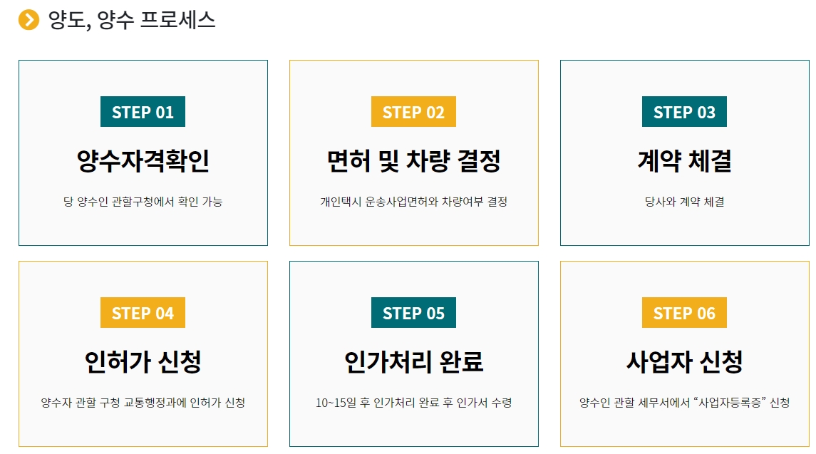5. 6번 사진은 명의 이전 절차 이후 개인택시 조합 가입, 사진표 수령, 운송사업면허 개시 신청, 미터기 장착 단계 등을 차례로 보여줍니다.