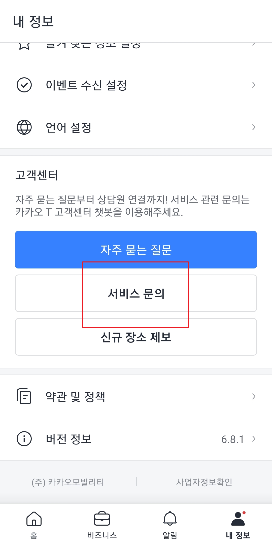 맨 아래를 보시면 (주)카카오모빌리티라고 적힌 회색 글씨가 보이실 거예요. 사실 이게 그냥 회사 정보 적어둔 텍스트처럼 보여서 그냥 지나치기 쉬운데요, 눌러보면 클릭이 되는 버튼입니다. 저도 우연히 눌러봤다가 발견했지 뭐예요.