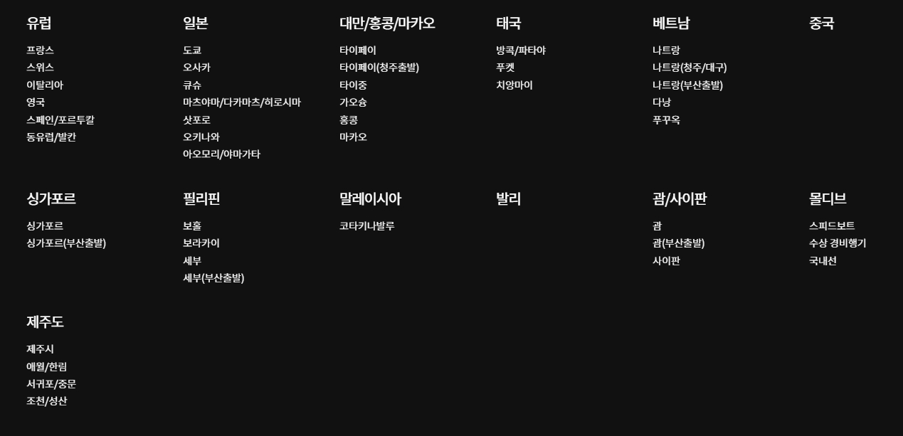 2. 해외여행 코너에서는 유럽, 일본, 대만/홍콩/마카오, 태국, 베트남, 중국, 싱가포르, 필리핀, 말레이시아, 발리, 괌/사이판, 몰디브 등 세계 여러 지역으로의 여행 상품을 세부적으로 안내하며, 각 상품은 일정일 수와 예산에 따라 필터링이 가능합니다. 다만 성수기에는 조기 마감되는 상품이 있으므로 예약 시점에 유의하셔야 합니다.
