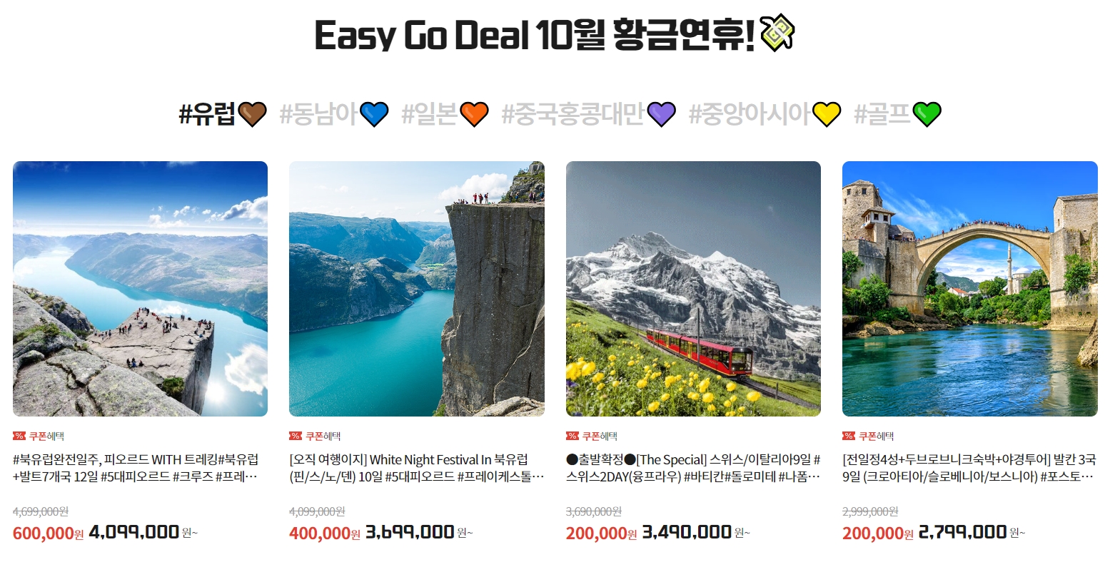 5. Easy Go Deal 코너에서는 특별 할인 혜택이 적용된 여행 상품을 소개하며, 예를 들어 북유럽, 이탈리아, 발칸 3국 여행 등 인기 지역의 상품이 할인된 가격으로 제공됩니다. 특히 얼리버드 예약 시 추가 할인 혜택이 제공될 수 있어 예산을 절약하려는 분께 유용합니다.