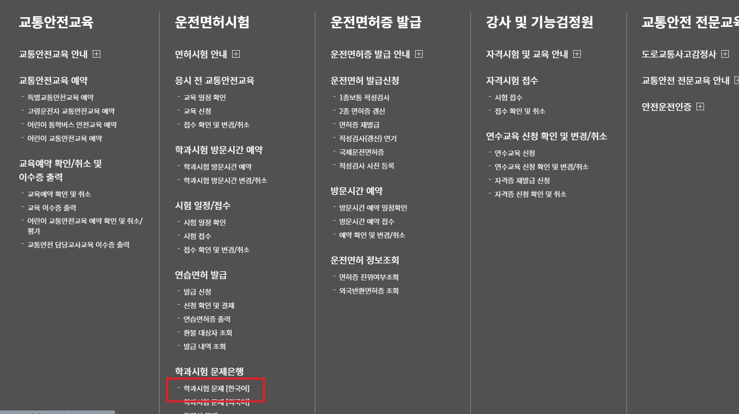 이 메뉴는 실제 시험에 출제되는 문제들을 모아놓은 공식 자료실이에요. 면허 시험장 예약이나 다른 민원 버튼을 누르지 않도록 메뉴명을 정확히 확인하고 들어가시는 게 좋아요. 저도 처음엔 메뉴가 많아서 어디 있는지 한참 찾았거든요.