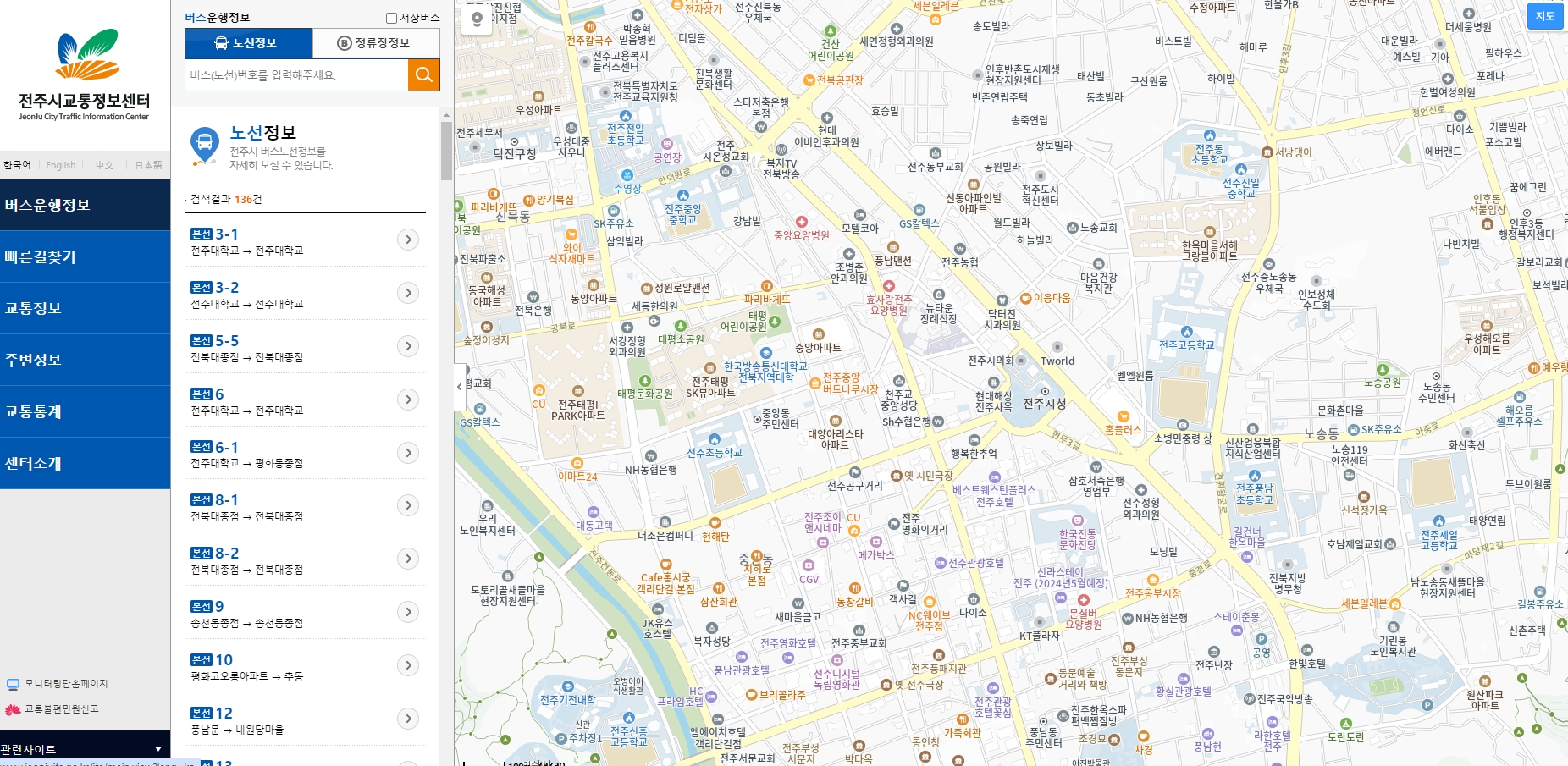 전주 시내의 모든 버스 정류장 위치를 지도상에서 한눈에 확인하는 기능