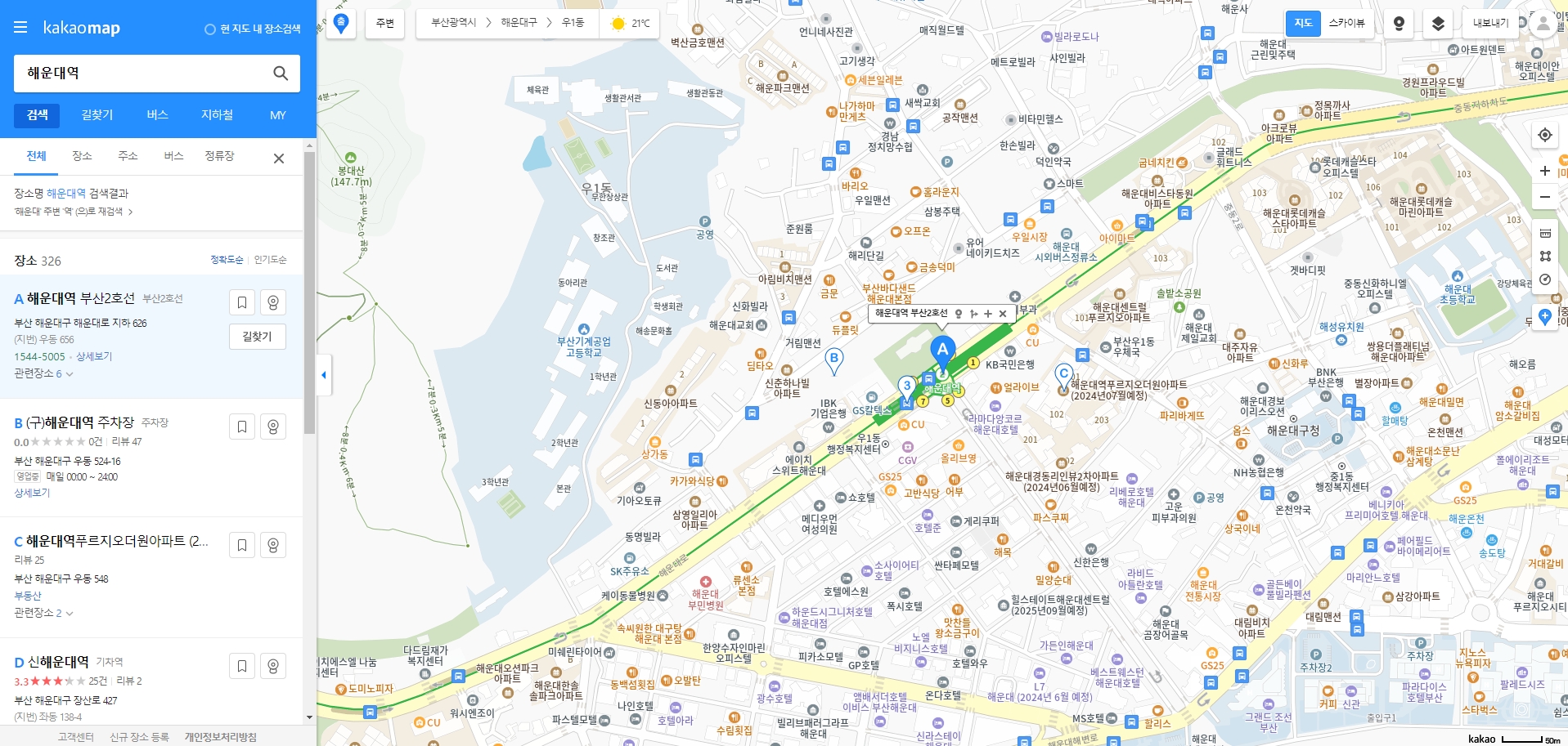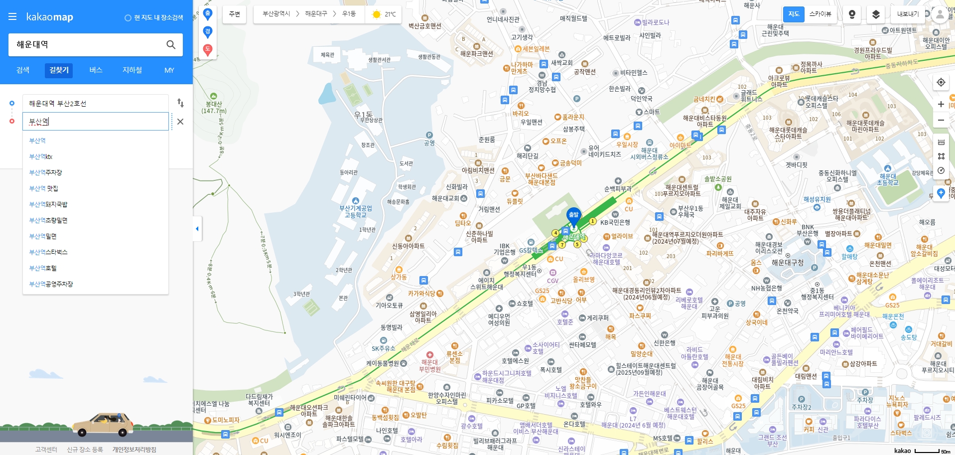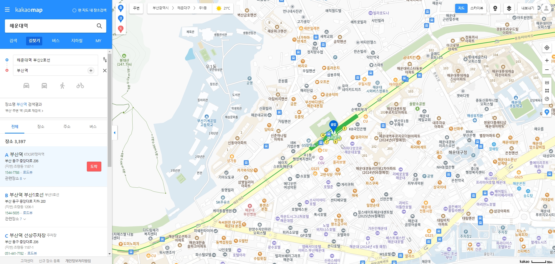 검색창에 원하는 장소를 입력하면 결과가 리스트로 쭉 나오는데요. 예를 들어 '해운대역'을 검색하면 해당 역의 위치가 지도에 표시돼요. 그런데 여기서 처음 쓰시는 분들이 많이 헷갈려 하시는 게, 바로 '길찾기' 버튼이 안 보인다는 점이에요.
