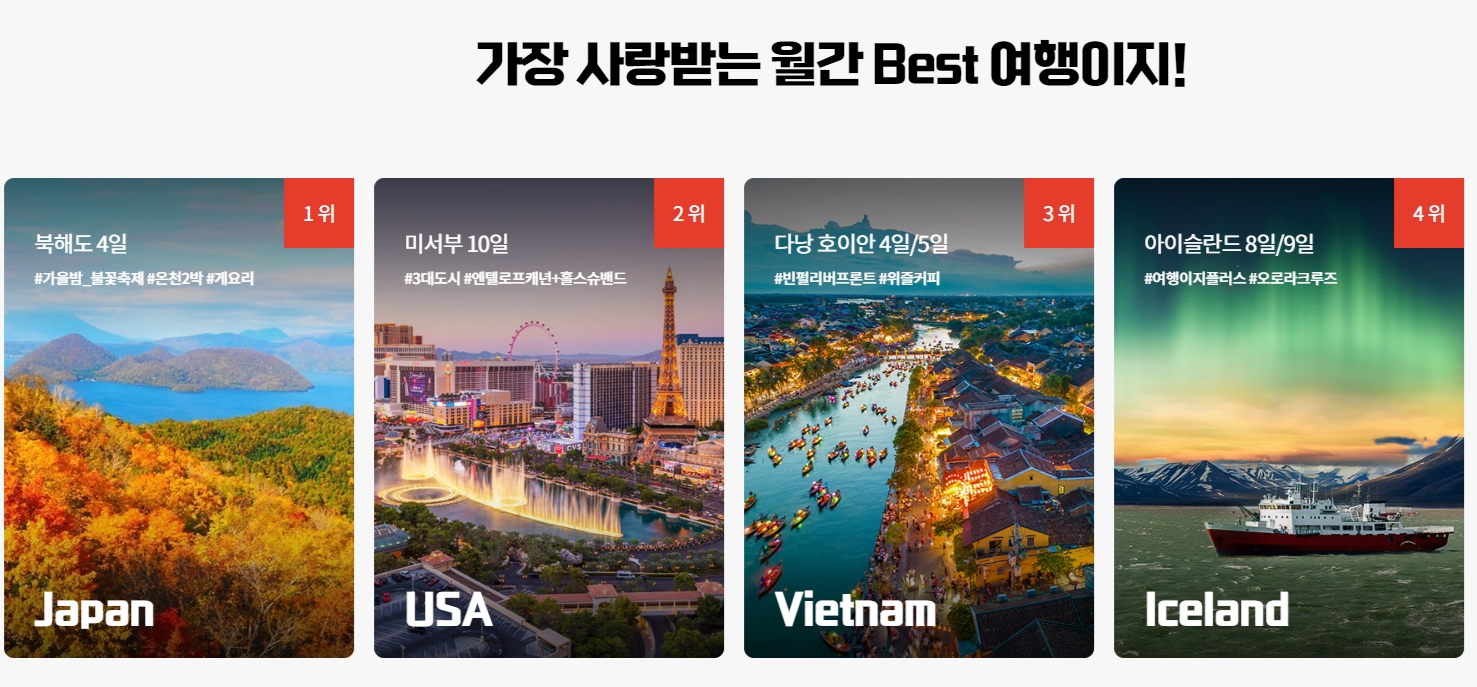 2. 해외여행 코너에서는 유럽, 일본, 대만/홍콩/마카오, 태국, 베트남, 중국, 싱가포르, 필리핀, 말레이시아, 발리, 괌/사이판, 몰디브 등 세계 여러 지역으로의 여행 상품을 세부적으로 안내하며, 각 상품은 일정일 수와 예산에 따라 필터링이 가능합니다. 다만 성수기에는 조기 마감되는 상품이 있으므로 예약 시점에 유의하셔야 합니다.