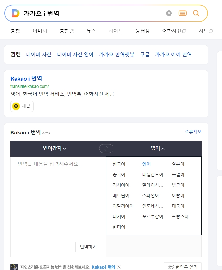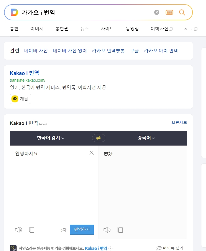 다음은 카카오 i 번역인데요, 아무래도 우리가 매일 쓰는 카톡이랑 연동성이 좋다는 게 최대 장점이에요. 하지만 구글이나 파파고랑 비교했을 때 아쉬운 점도 분명히 존재하더라고요.