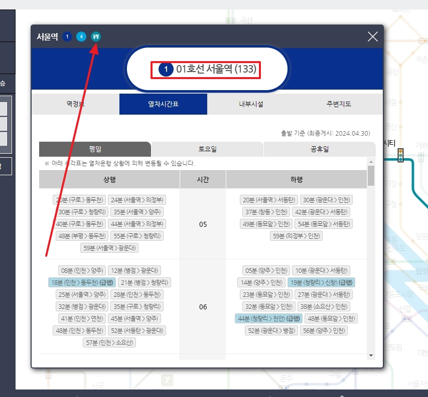이제 구체적인 시간을 확인해 볼 차례인데요. 지도상에서 출발하려는 역(예: 서울역)을 클릭하면 팝업창이 뜨면서 상세 정보를 볼 수 있어요. 처음에는 기본적으로 1호선 정보가 뜰 수 있는데, 당황하지 마시고 상단 탭에서 비행기 아이콘이나 공항철도 탭을 눌러서 전환해 주시면 돼요.