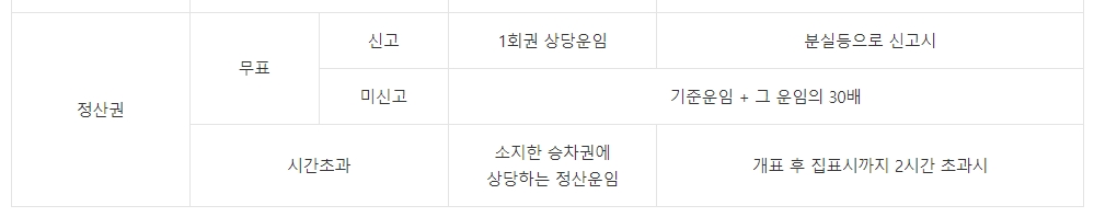 8. 정산권을 이용하실 경우 무표 신고 시 1회권 상당의 운임을 납부해야 하며, 미신고 상태에서는 기준 운임과 초과 운임의 30배가 부과됩니다. 또한 개찰 후 2시간 이내 이용이 원칙이며 시간 초과 시 추가 요금이 발생하니 주의하셔야 합니다.