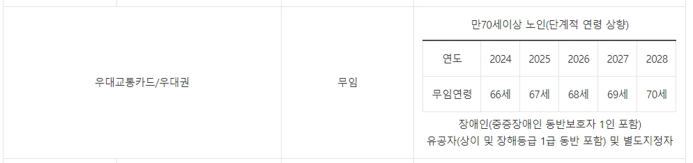 6. 우대교통카드 및 우대권을 사용하시는 만 70세 이상 노인, 장애인, 국가유공자는 무임 승차가 가능합니다. 다만 2024년에는 만 66세부터 적용되며 이후 매년 1세씩 상향 조정되어 2028년에는 만 70세부터 혜택을 받을 수 있습니다.