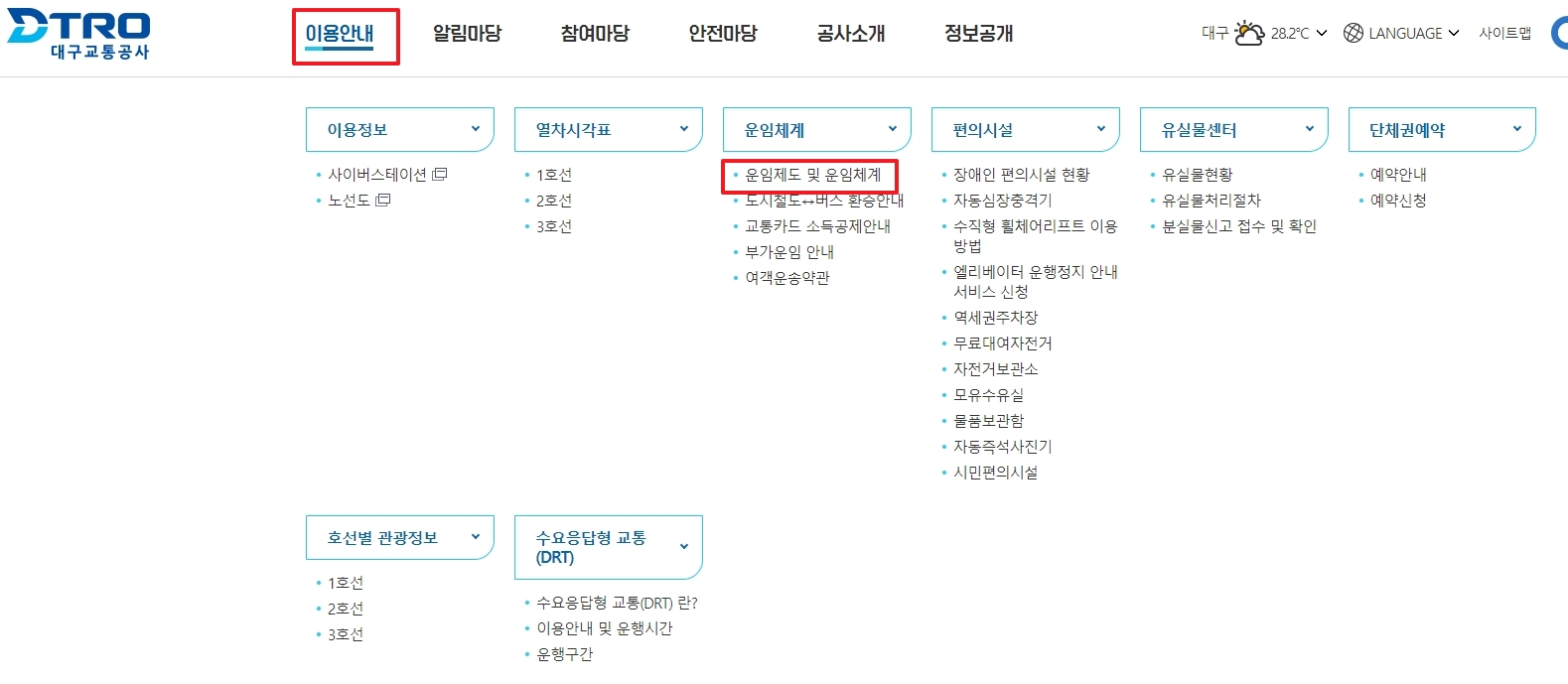 2. 이용안내 메뉴에서 운임체계 항목을 클릭하시면 균일운임제도와 세부 요금 체계를 한눈에 확인하실 수 있습니다. 변경 사항이나 특별 할인 기간 등은 해당 항목에서 별도 안내됩니다.