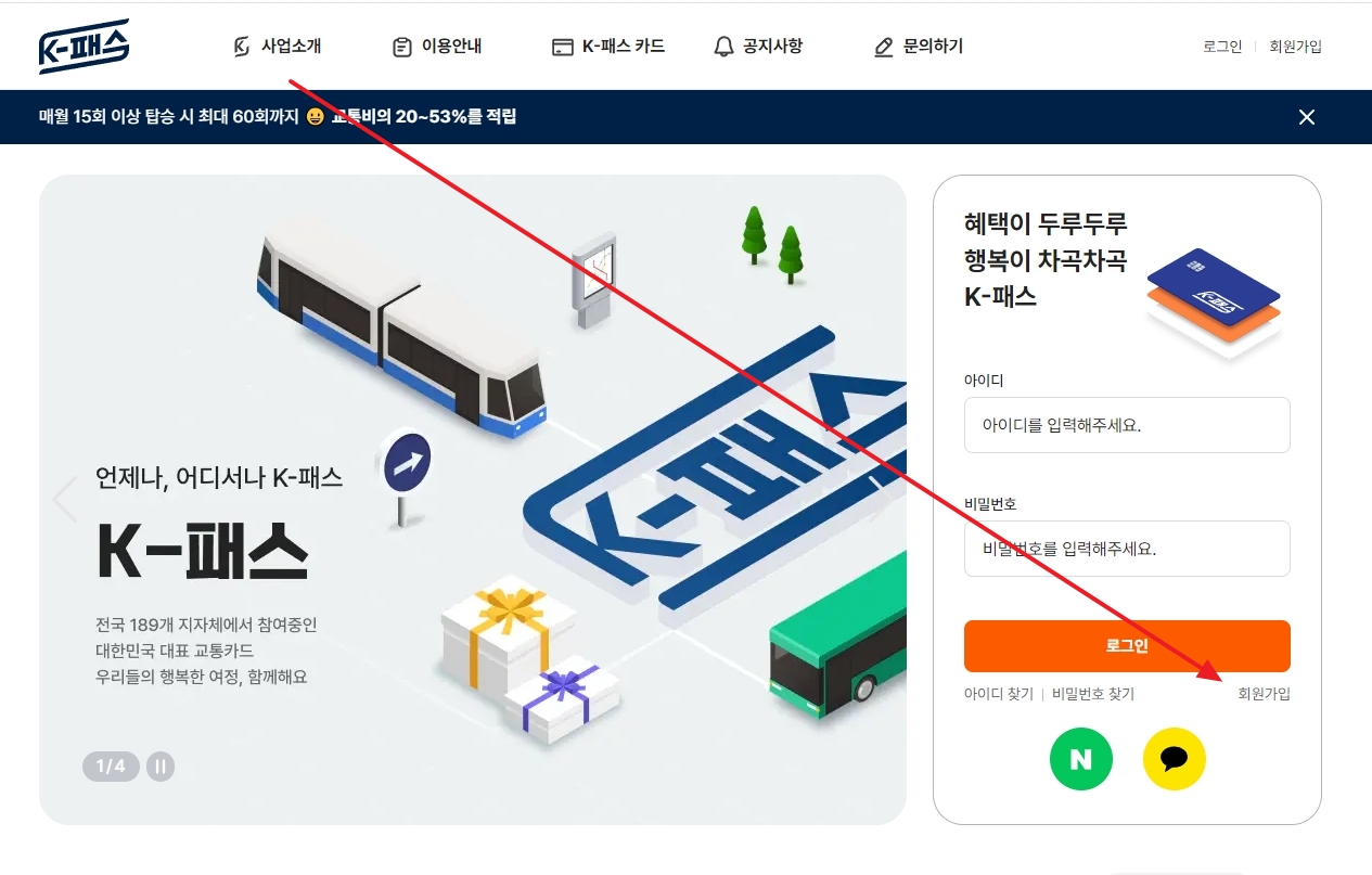 우선 등록을 위해서는 K-패스 공식 홈페이지에 접속해 주셔야 해요. 포털 사이트에서 검색하면 바로 상단에 뜨니까 찾기는 어렵지 않으실 거예요. 홈페이지 메인 화면에 들어가면 회원가입부터 전환 신청, 그리고 선불/후불 교통카드 발급 안내까지 다양한 메뉴를 확인하실 수 있거든요.