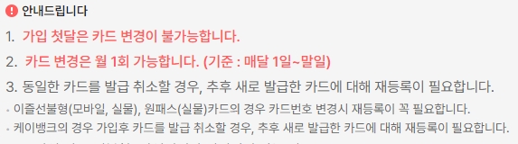 여기서부터는 정말 중요한 주의사항이니 꼼꼼히 봐주세요. 카드를 처음 등록한 달, 즉 가입 첫 달에는 카드 변경이 절대 불가능합니다. 그래서 처음에 어떤 카드를 쓸지 신중하게 결정하시는 게 좋아요. 그 이후부터는 매달 1일부터 말일 사이에 딱 한 번만 변경할 수 있는 기회가 생깁니다.