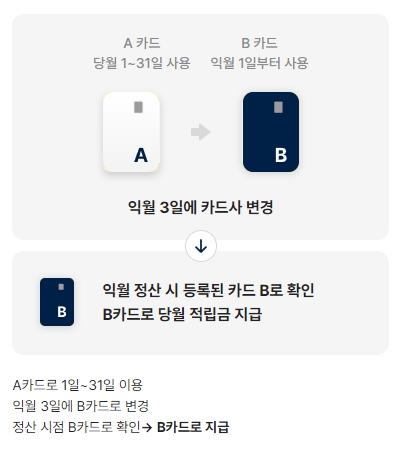 또 다른 케이스로, 달이 바뀐 직후에 카드를 변경하는 경우도 있죠. 만약 1월 31일까지 A카드를 쓰고 2월 3일에 B카드로 변경했다면, 2월에 받는 1월분 적립금은 B카드로 들어오게 됩니다. 정산 시점에 시스템상 B카드가 등록되어 있기 때문이에요.