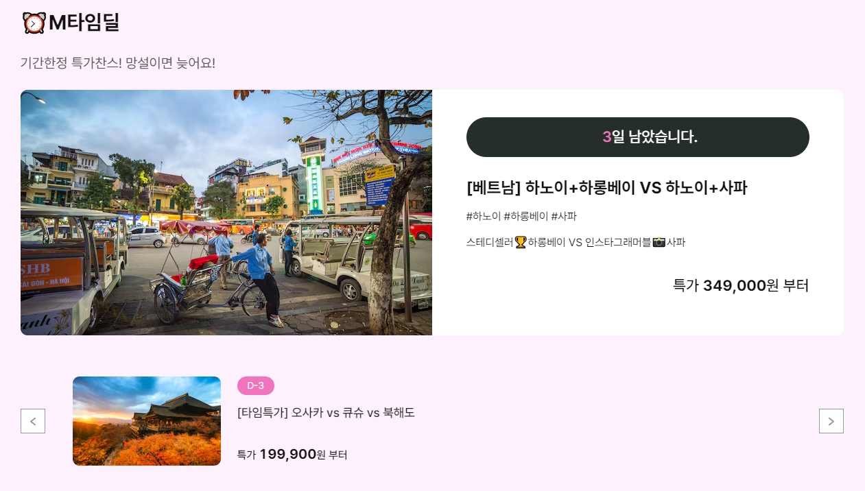 5. ME타임딜 코너에서는 한정 기간 특가 상품을 빠르게 확인해 저렴하게 예약할 수 있습니다. 다만 인기상품은 수량이 한정적이니 출시 시점을 놓치지 않도록 주의해야 합니다.