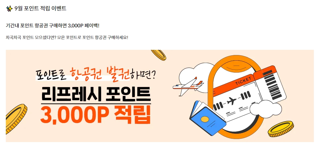 4. 포인트 적립 이벤트와 할인 쿠폰을 통해 여행 후 적립된 리프레시 포인트를 다음 항공권 구매 시 활용할 수 있습니다. 단, 포인트 유효 기간이 있으니 미리 확인해 주시기 바랍니다.
