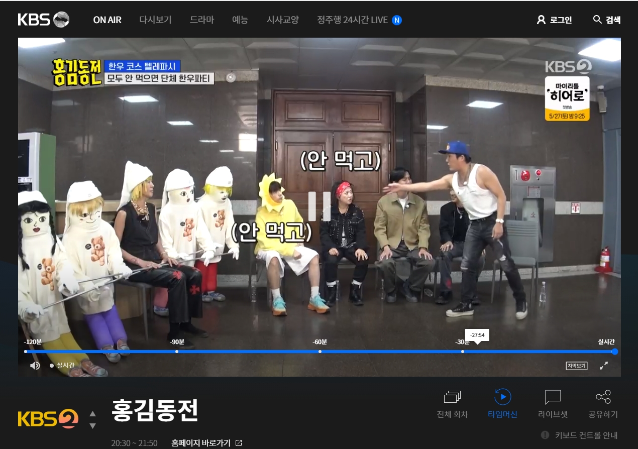이 KBS 온에어 서비스에는 타임머신 기능이라는 것도 포함되어 있어서, 최근 2시간 이내 방송은 다시 돌려볼 수가 있습니다. 실시간으로 못 본 장면이 있다면 뒤로 돌려보거나, 잠깐 정지해뒀다가 이어서 볼 수도 있어 정말 편리합니다.