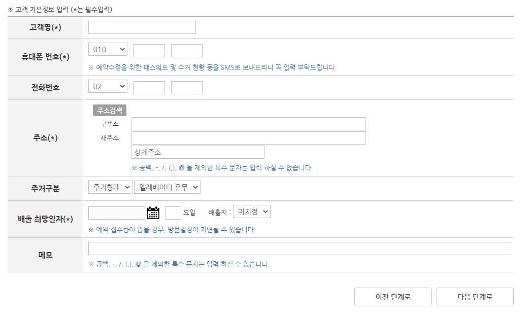 가장 중요한 정보 입력 단계입니다. 이름과 연락처, 주소를 정확히 입력해야 기사님이 찾아오실 수 있겠죠? 특히 배출 희망 일자는 신청일 기준으로 보통 일주일 뒤부터 선택 가능한 경우가 많아요.