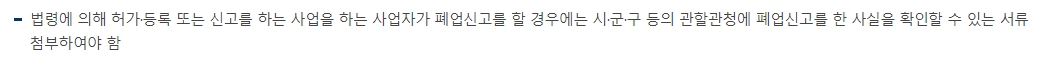 만약 운영하던 사업이 시청이나 구청 등에서 허가나 등록을 받아야 하는 업종이라면 주의가 필요합니다. 이런 경우에는 세무서에 폐업 신고를 할 때, 해당 관청에 먼저 폐업했다는 사실을 증명하는 서류를 받아서 함께 제출해야 합니다.