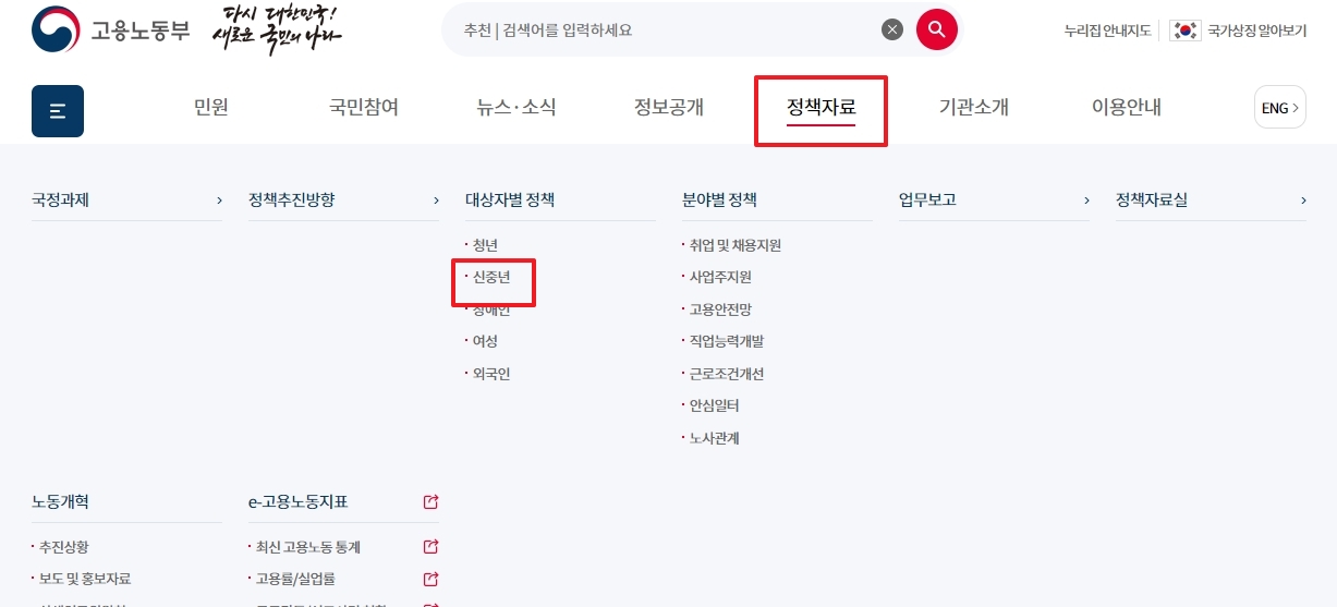 웹사이트 메뉴에서 신중년 정책 찾아가는 경로