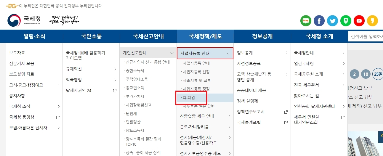 홈택스 사이트 상단에 있는 여러 메뉴 중 '국세정책/제도'를 선택한 뒤, '사업자등록안내'를 클릭하고, 마지막으로 '휴폐업' 항목을 누르면 관련 페이지로 이동합니다. 이 메뉴에서는 사업을 잠시 쉬는 휴업 신고와 완전히 종료하는 폐업 신고에 대한 모든 안내를 확인할 수 있습니다.