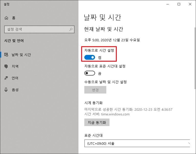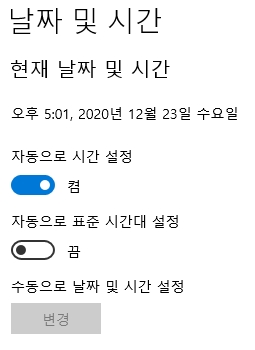 '자동으로 시간 설정'을 일부러 끄는 경우도 있습니다. 예를 들어 인터넷이 안되는 환경이라거나 특별한 목적으로 시간을 다르게 설정해야 할 때가 그렇습니다. 이 스위치를 끄면 아래쪽에 있는 '날짜 및 시간 수동으로 설정' 부분의 '변경' 버튼이 활성화됩니다.